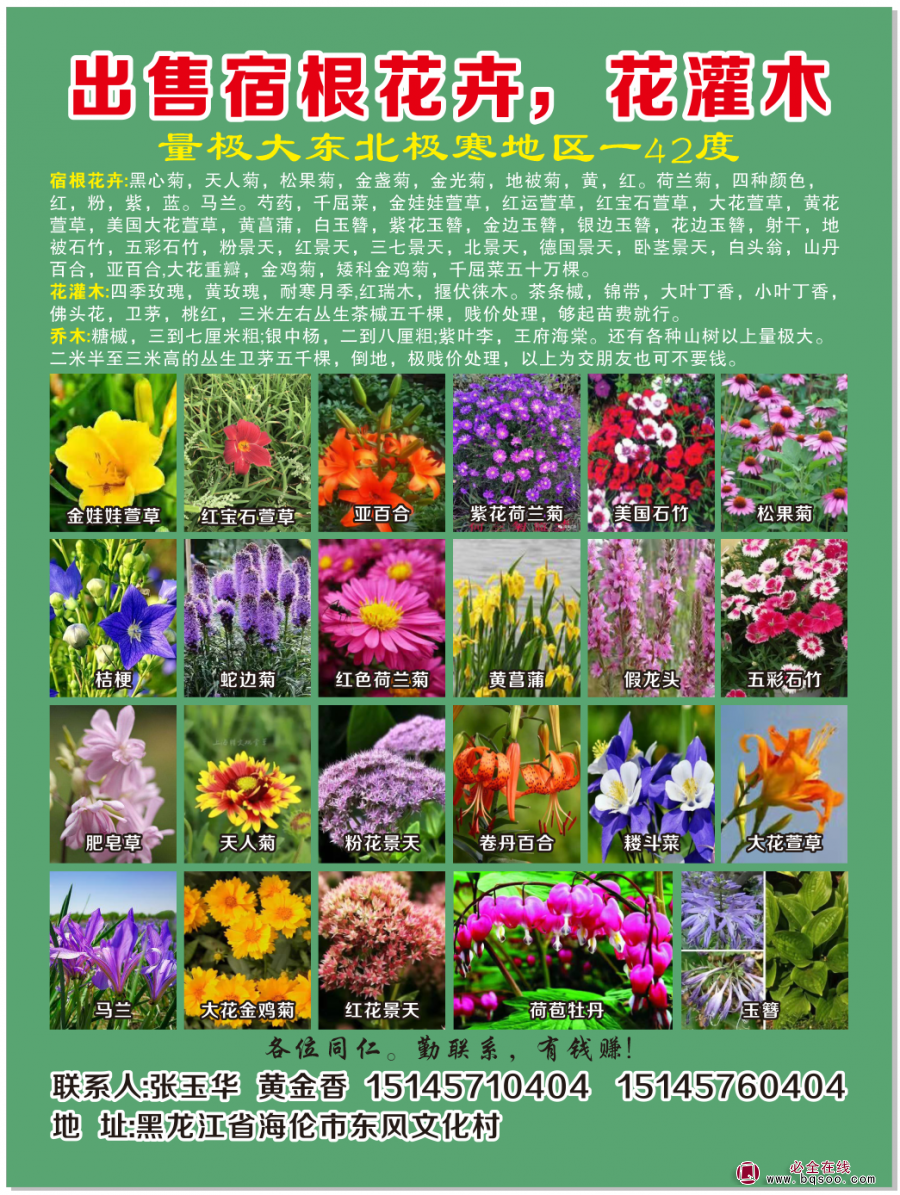 黑龙江绥化耐寒耐旱宿根花卉花灌木基地出售宿根花卉,花灌木,量极大东北极寒地区一42度。宿根花卉:黑心菊,天人菊,松果菊,金盏菊,金光菊,地被菊,黄,红。荷兰菊,四种颜色,红,粉,紫,蓝。马兰。芍药,千屈菜,金娃娃萱草,红运萱草,红宝石萱草,大花萱草,黄花萱草,美国大花萱草,黄莒蒲,白玉簪,紫花玉簪,金边玉簪,银边玉簪,花边玉簪,射干,地被石竹,五彩石竹,粉景天,红景天,三七景天,北景天,德国景天,卧茎景天,白头翁,山丹百合,亚百合,大花重瓣,金鸡菊,矮科金鸡菊,千屈菜五十万棵。