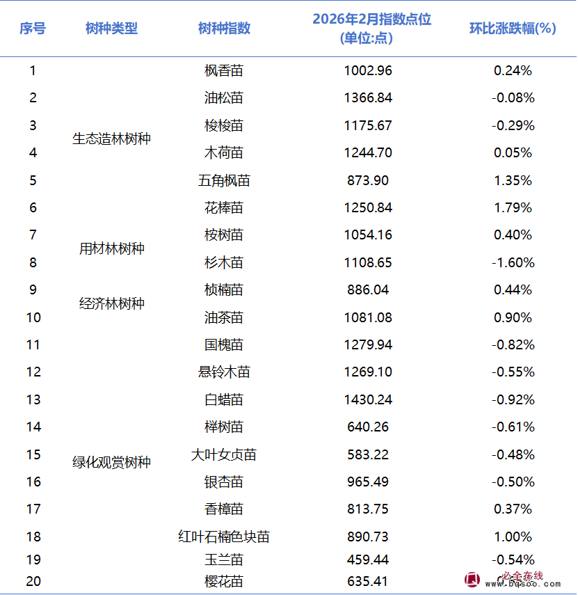 2026年2月,20大树种指数环比“8涨12跌”,年初市场淡季,纳入监测的20个树种苗木行情过半数下跌。