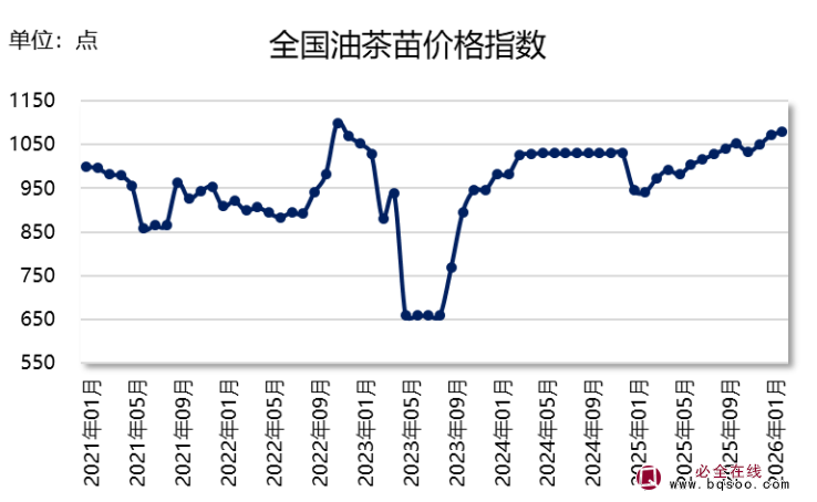 2026年2月,全国油茶苗价格指数为1081.08点,环比上涨0.90%。