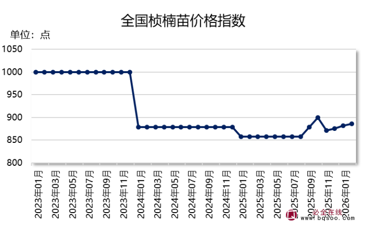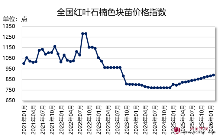 红叶石楠色块苗作为绿化观赏相对大宗用量苗木,秋季道路及园林绿化补植需求增加,行情持续微涨。2026年2月,全国红叶石楠色块苗价格指数为890.73点,环比上涨1.00%。