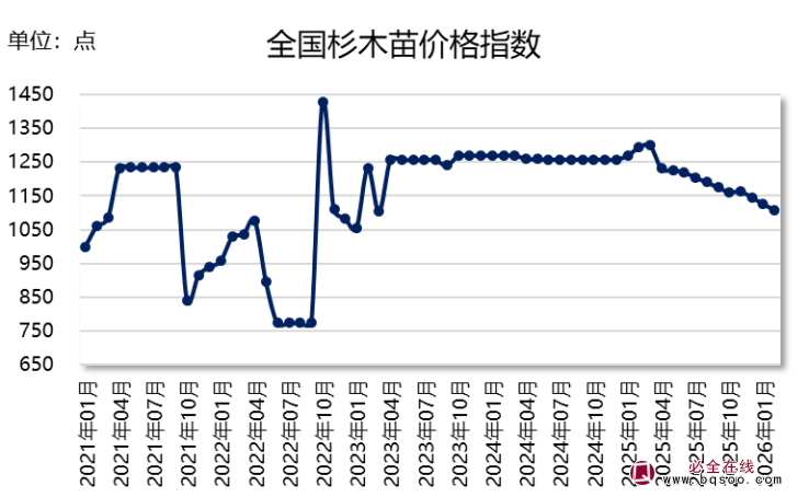 杉木是我国南方特有的用材树种,用途广泛。由于前两年杉木苗需求大幅增加推高行情,杉木育苗量大幅增加,市场处于供过于求的局面,行情整体持续下行。2026年2月,全国杉木苗价格指数报1108.65点,环比下跌1.60%。