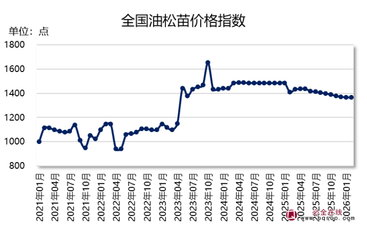 油松苗在2025年春季造林进入尾声后,需求大幅减少,行情缓慢下行。2026年2月,全国油松苗价格指数为1366.84点,环比下跌0.08%。