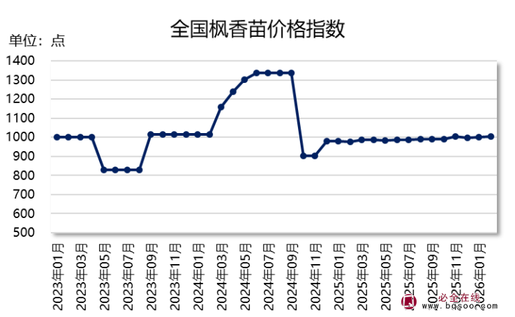 枫香作为优良的景观绿化、生态修复和用材树种,近年来在市政工程和荒山造林中应用广泛。2026年2月,全国枫香苗价格指数为1002.96点,环比上涨0.24%。