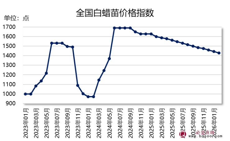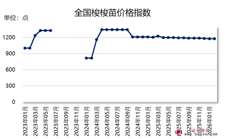 白蜡广泛栽培于中国南北的各个省区,是防风固沙和护堤护路的优良树种。目前,白蜡苗总体供应过剩,山东、河北主产区库存积压严重,市场价格波动下行。2026年2月,全国白蜡苗价格指数为1430.24点,环比跌0.92%。