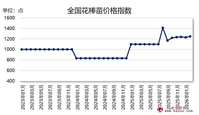 花棒是亚洲中部荒漠、半荒漠地带的植物种,适于流沙环境,喜沙埋,抗风蚀,耐严寒酷热,防风固沙作用大。随着“三北”工程等国家生态战略深入推进,花棒苗需求量持续增长。2026年2月,全国花棒苗价格指数为1250.84点,环比上涨1.79%。