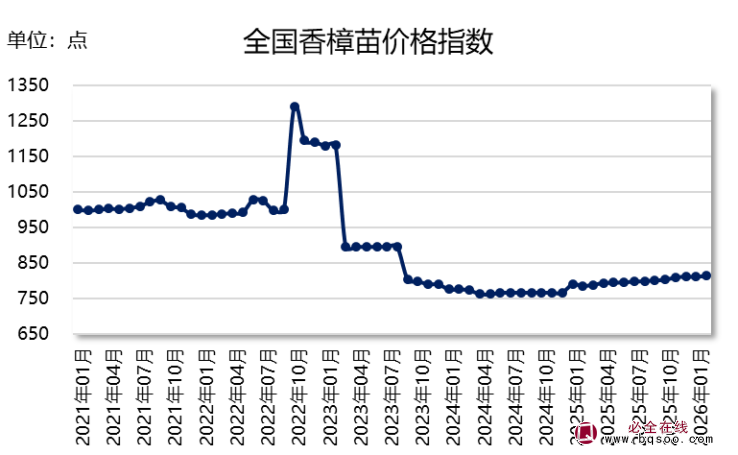 香樟,俗称樟树,广泛分布于东亚地区,因其独特的香气与风味而备受青睐。近三年来,香樟面临较大的去库存压力,市场整体供过于求,价格指数总体处于下滑趋势。2025年,全国多地启动“林荫道路提质工程”,香樟作为主干道常绿乔木需求和市场行情均微幅上涨。2026年2月,全国香樟苗价格指数延续上行走势,指数报813.75点,环比上涨0.37%。