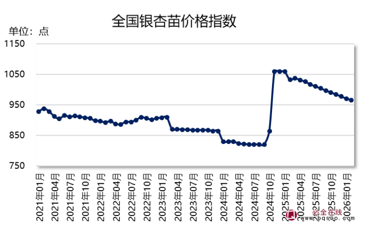 当前银杏主产区库存较大,产区多以去库存为主价格走低。2月,全国银杏苗价格指数为965.49点,环比下跌0.50%。