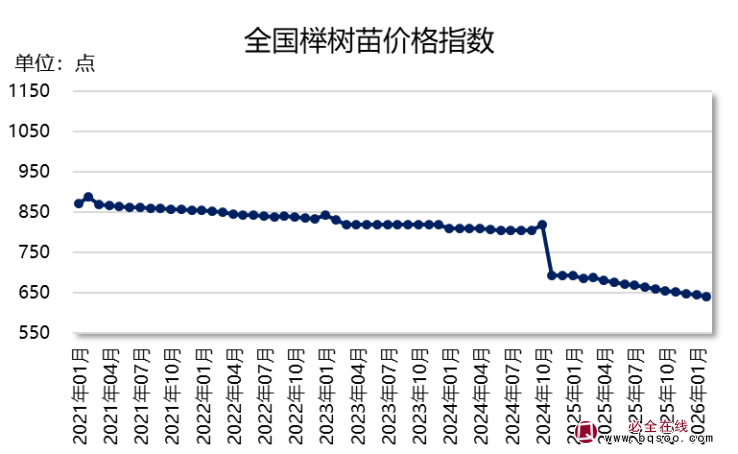榉树作为优质景观树种,近年来榉树育苗热导致市场存量激增,远超实际需求,而市政工程在减少传统行道树的使用,榉树在新项目中的占比下降,供需失衡下榉树苗行情持续下行。2026年2月,全国榉树苗价格指数报640.26点,环比下跌0.61%。