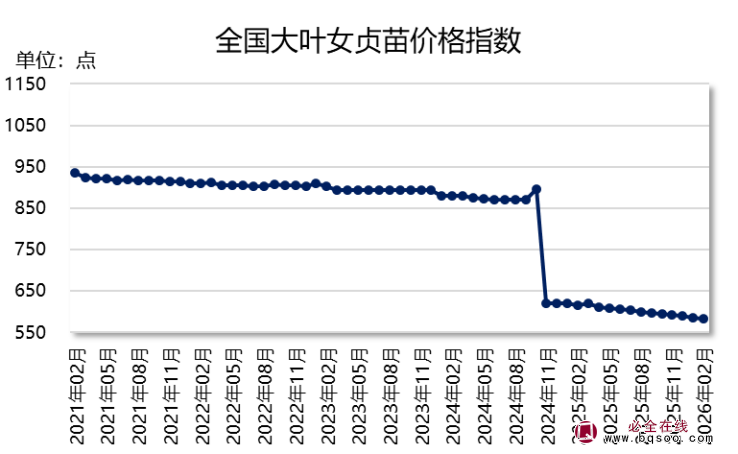 大叶女贞作为传统乡土树种,苗圃存量大,当前走货缓慢,行情持续下行。2026年2月,全国大叶女贞苗价格指数结果报583.22点,环比下跌0.48%。