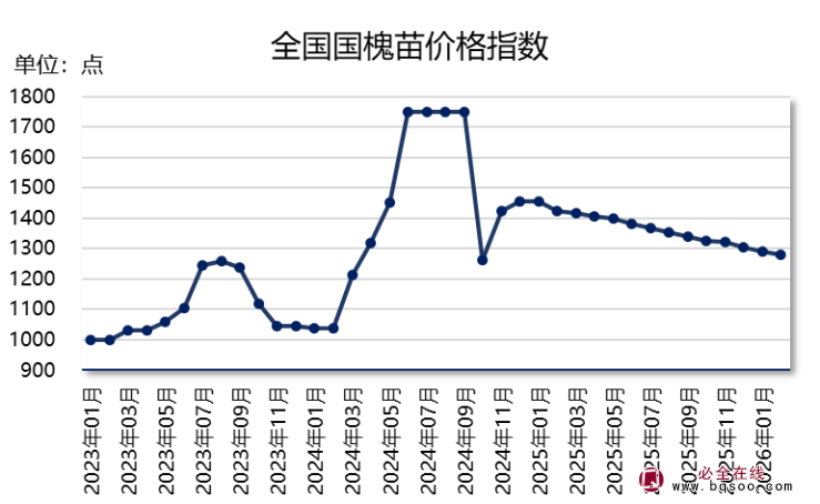 由于北方国槐主产区近年来扩张较快,导致短期内国槐苗下跌明显。自2024年11月至今,价格持续震荡下行。2026年2月,全国国槐苗价格指数为1279.94点,环比下跌0.82%。