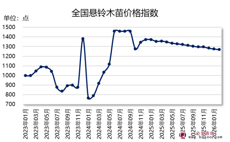 近年来,悬铃木因适应性强,用途广,成为苗圃种植热门品种,存圃量持续扩大导致当前产能过剩,全国悬铃木苗价格持续下跌。2月,指数报1269.10点,环比下跌0.55%。