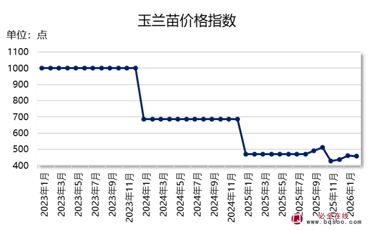 玉兰为木兰科木兰属落叶乔木,是园林中重要的早春观花树种,广泛栽培于各地庭园和街道绿化中。受供应过剩、市场需求减弱和替代品种竞争等因素影响,玉兰苗市场价格整体走低。2026年2月,全国玉兰苗价格指数为459.44点,环比下跌0.54%。