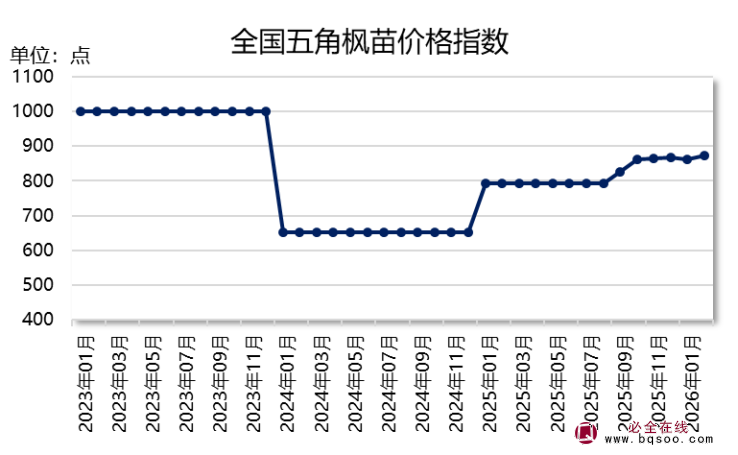 五角枫是无患子科槭属的落叶乔木,主要分布于中国东北、华北和长江流域各省,绿化成景效果好。春季走货小幅增加,五角枫价格微幅上涨。2026年2月,全国五角枫苗价格指数为873.90点,环比上涨1.35%。