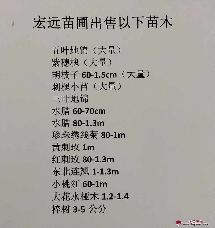 经营内容:云杉1.5-6米(大量),油松2米(1000棵冠幅饱满),火炬3-4公分大量,白桦,梓树,山杏,京桃,垂榆,李子树冠幅饱满,水腊大量,榆叶梅,四季锦带1.3-1.5米大量,日本绣线菊大量,珍珠绣线菊大量,五叶地锦大量,红绿木大量,东北连翘大量,红王子锦带大量,金叶榆,刺槐当年小苗大量,油条当年小苗大量,等等各种花卉,本苗圃自产。