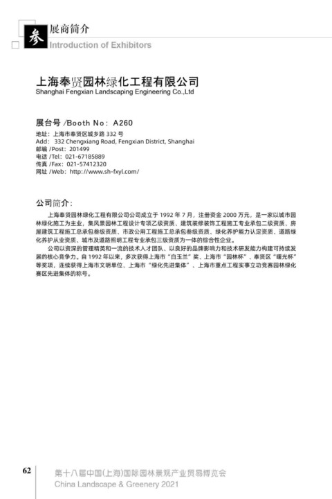 上海奉贤园林绿化工程有限公司公司成立于 1992 年 7 月,注册资金 2000 万元,是一家以城市园 上海加缘园林绿化工程有限公司成立于 1997 年,是一家集园林景观设计、绿化施工养护、花卉苗