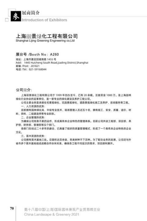 上海丽景绿化工程有限公司于 1999 年创办至今,已有 20 余载。注册资金 1000 万。是上海园林 上海绿神生态园艺有限公司(以下简称:公司)成立于 1989 年,从其前身为上海市前哨农场林果