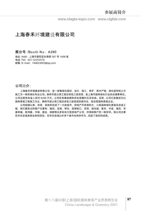 上海植物园绿化工程有限公司成立于 1999 年,具有城市园林绿化壹级资质、风景园林工程设计专 上海春禾环境建设有限公司,是一家集绿化规划、设计、施工、养护、苗木产销、绿化装饰和土方