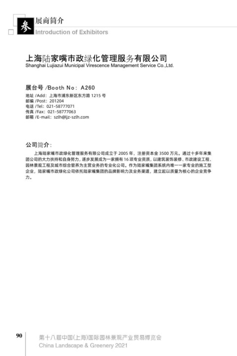 园林景观工程及城市综合管养为主营业务的专业化公司。作为陆家嘴集团系统内唯一一家专业的施工型 园林绿化企业施工纸质,乙级风景园林设计和专业养护资质,通过 ISO9001 质量管理体系国际认证及