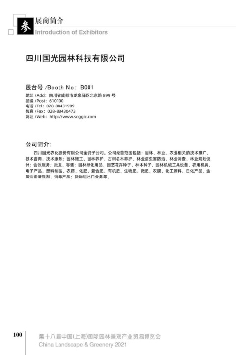 四川国光农化股份有限公司全资子公司。公司经营范围包括:园林、林业、农业相关的技术推广、 本公司专业从事雕塑设计与制作 , 主要承接石材雕塑、铸锻铜雕塑、不锈钢雕塑、玻璃钢雕塑、浮