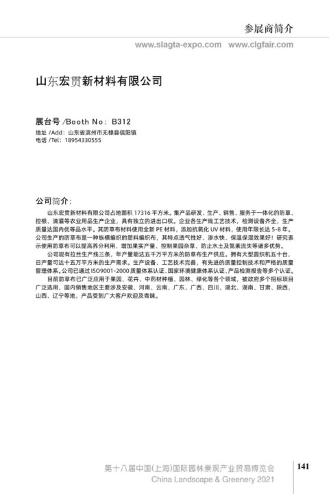 江苏香叶建材科技有限公司成立于 2015 年,位于东台市,本公司现为国家高新技术企业,和盐城 山东宏贯新材料有限公司占地面积 17316 平方米。集产品研发、生产、销售、服务于一体化的防草、