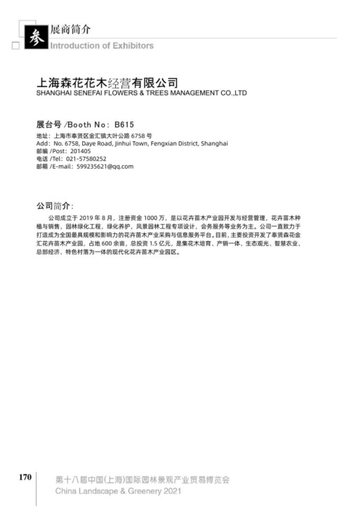 打造成为全国最具规模和影响力的花卉苗木产业采购与信息服务平台。目前,主要投资开发了奉贤森花·金 生态无机透水砖、冷拌冷铺彩色沥青、生态透水无机混凝土、树穴盖板、生态护坡、生态浮岛等,下设