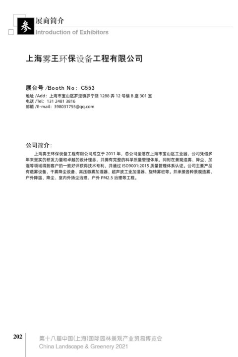 上海雾王环保设备工程有限公司成立于 2011 年,总公司坐落在上海市宝山区工业园,公司凭借多