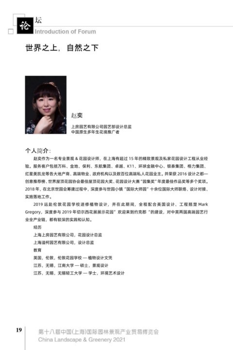 赵奕作为⼀名专业景观 & 花园设计师,在上海有超过 15 年的精致景观及私家花园设计⼯程从业经 长江商学院金融 MBA
