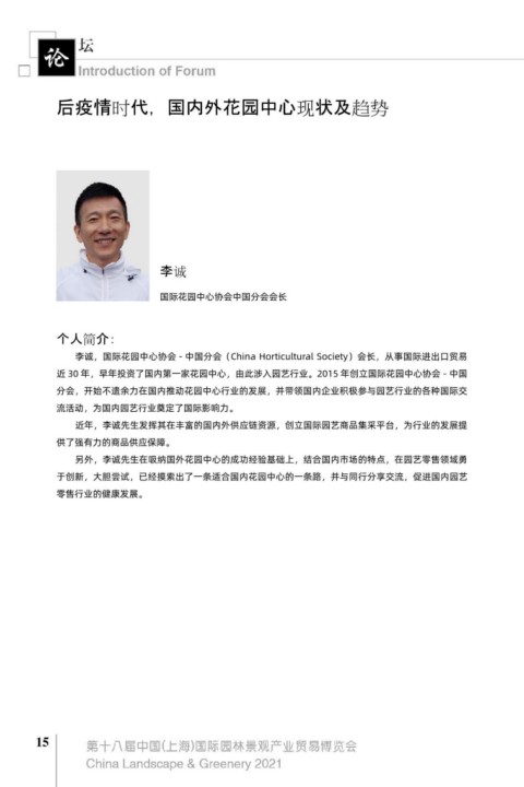 李诚,国际花园中心协会 - 中国分会(China Horticultural Society)会长,从事国际进出口贸易 李夺,第 44 届世界技能大赛园艺项目中国技术指导专家,农业部职业技能鉴定指导中心特邀专家,
