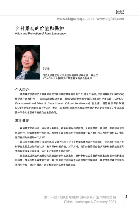 国大百科全书》第三版风景园林学条目,并受邀担任《园林》、《中国园林》杂志编委会委员,于《中 报告通过世界遗产地黄山和武陵源的乡村实践案例,解析乡村社区卓越的传统生态智慧对保护生物